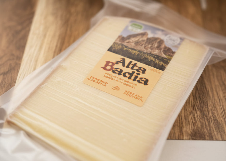 Der Alta Badia ist ein italienischer Hartkäse aus Südtirol, hergestellt aus pasteurisierter Kuhmilch und mit 50 % Fett i. Tr. Besonders fein: Er ist von Natur aus laktosefrei und damit auch für empfindliche Genießer bestens geeignet.